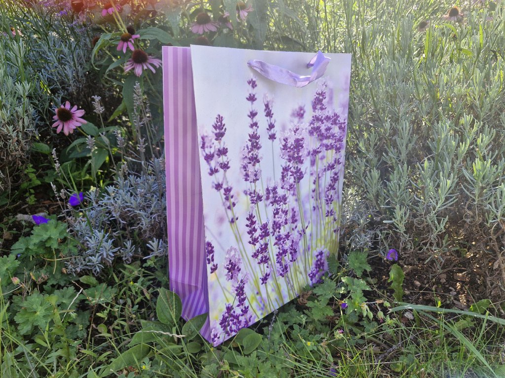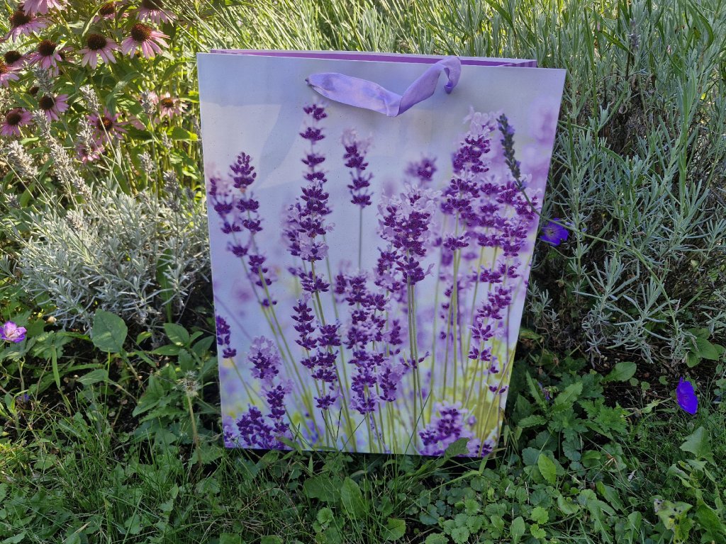 Krásná dárková papírová taška s motivem levandule. Papírová taška má rozměr 30 x 40 x 11,5 cm ( Šířka, výška, hloubka )
