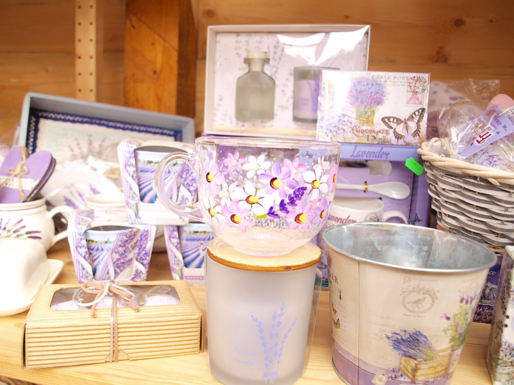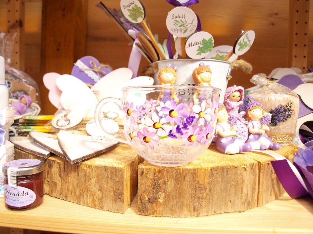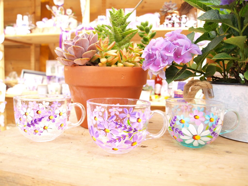 Hrnek z varného skla, malovaný dekorem květin a snítky levandule.