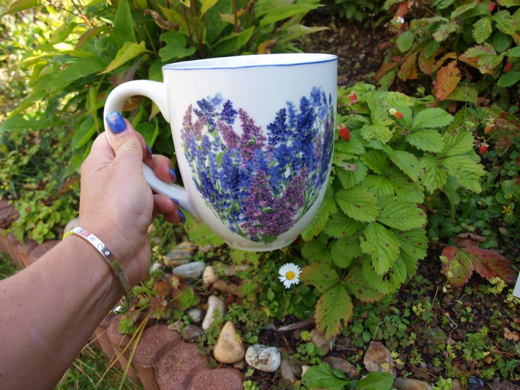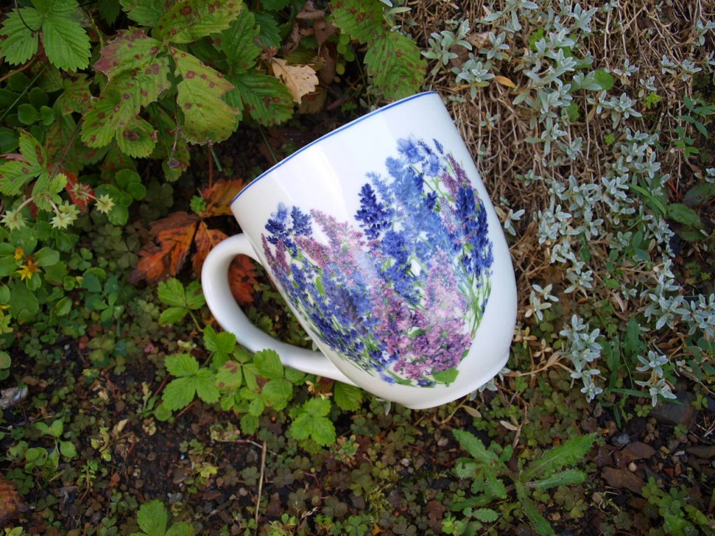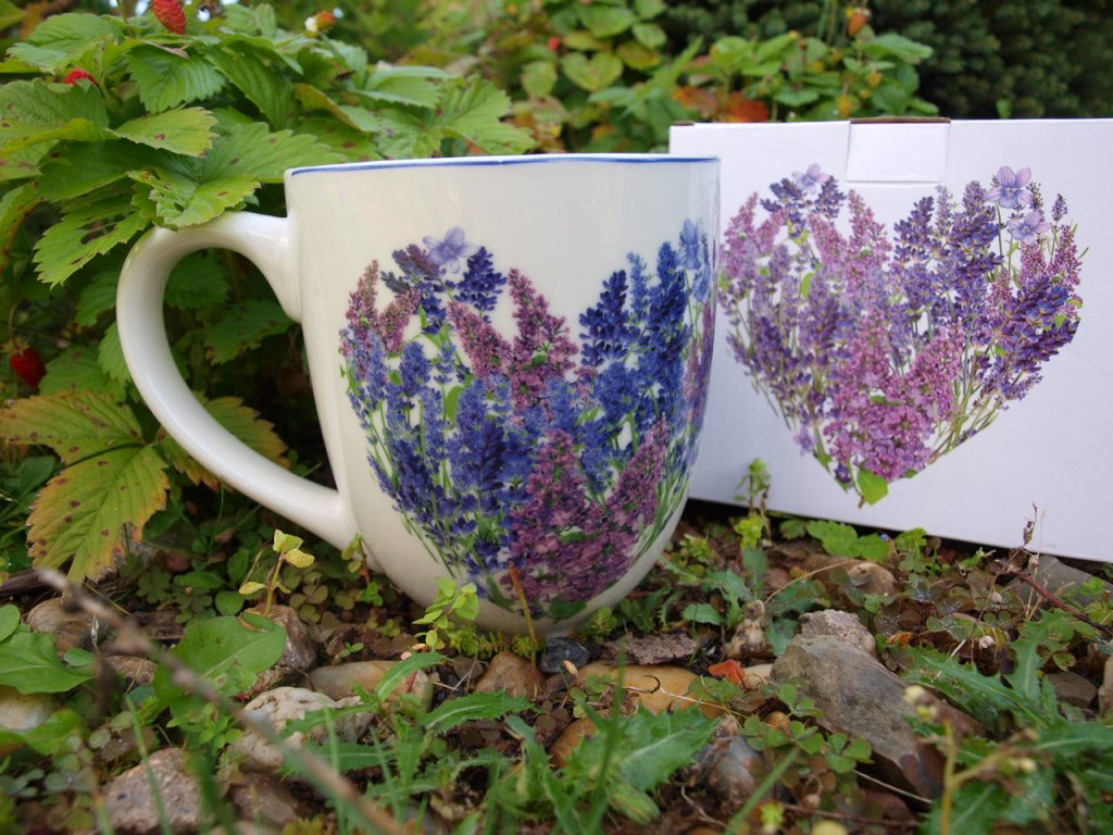 Opravdu velký buclatý hrnek s motivem levandule na váš oblíbený teplý nápoj