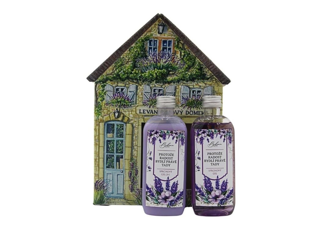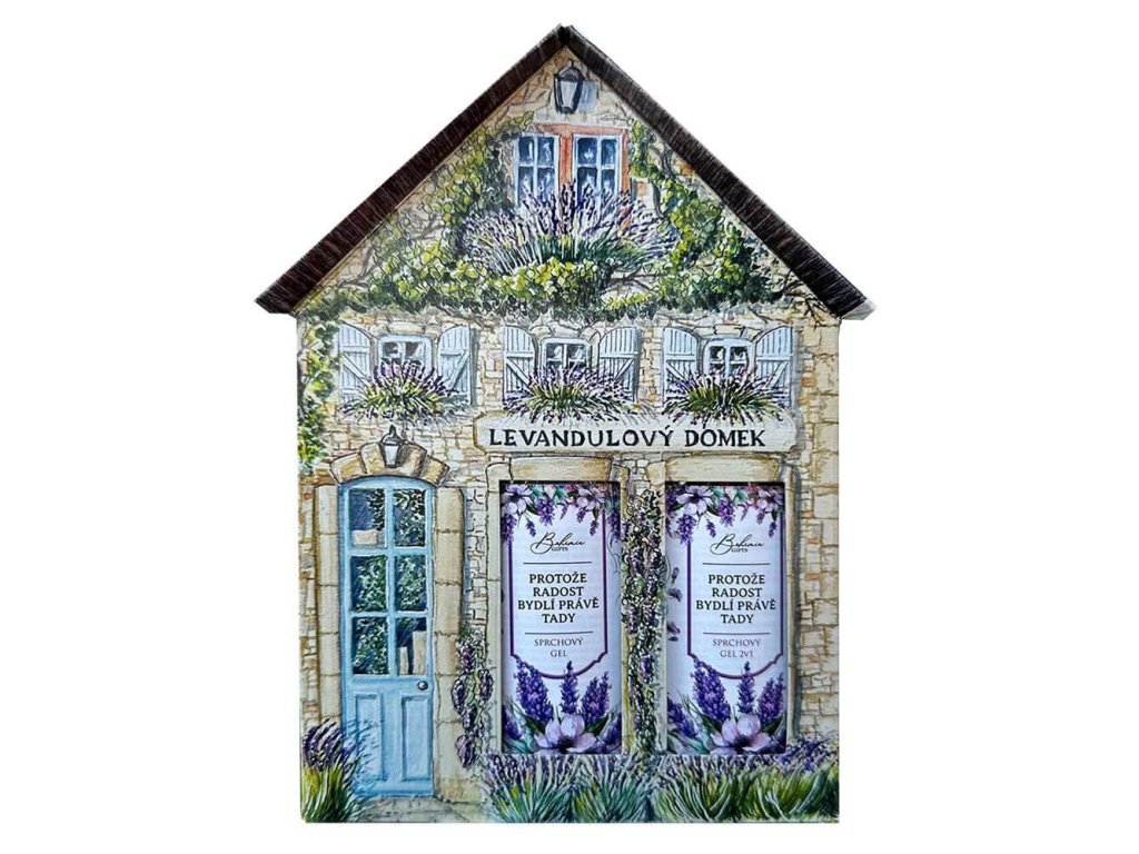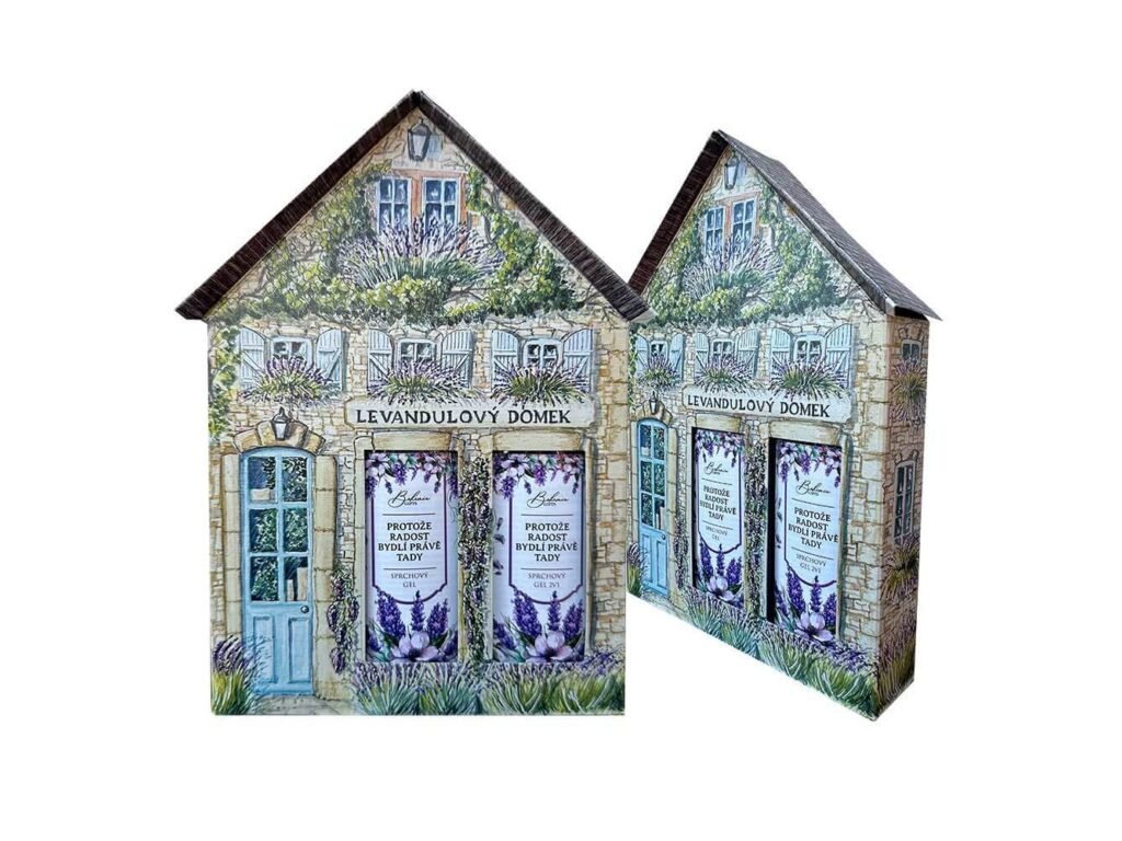 Celý set je zabalen do krásného domečku s levandulovým motivem, takže se skvěle hodí jako hotový dárek bez nutnosti dalšího balení.