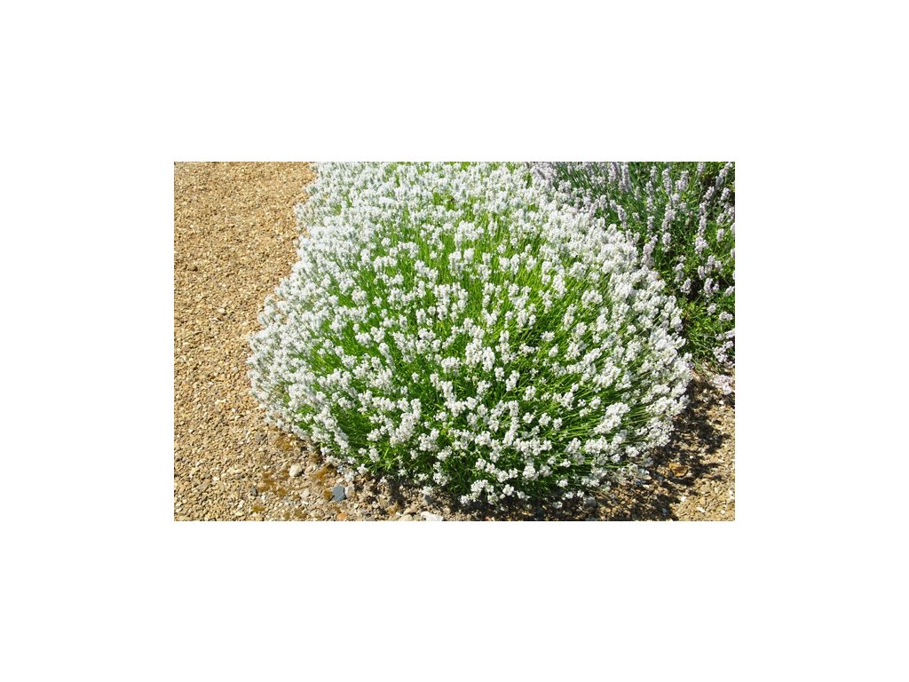 Bíle kvetoucí levandule lékařská, listy úzké, sytě zelené Větší rostlina - květináč 13 cm Mrazuvzdorná, naše česká sadba Medonosná bylina Vhodná ke kombinaci s ostatními kultivary levandule lékařské