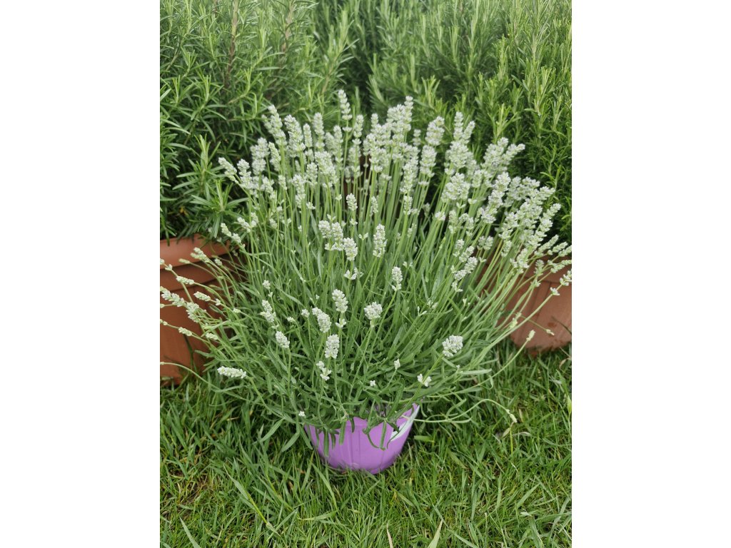 Levandule francouzská - prostřední v květináči o průměru 18 cm Dlouhá, bílá květenství. Levandule je již po zpětném řezu Dorůstá cca 50 cm