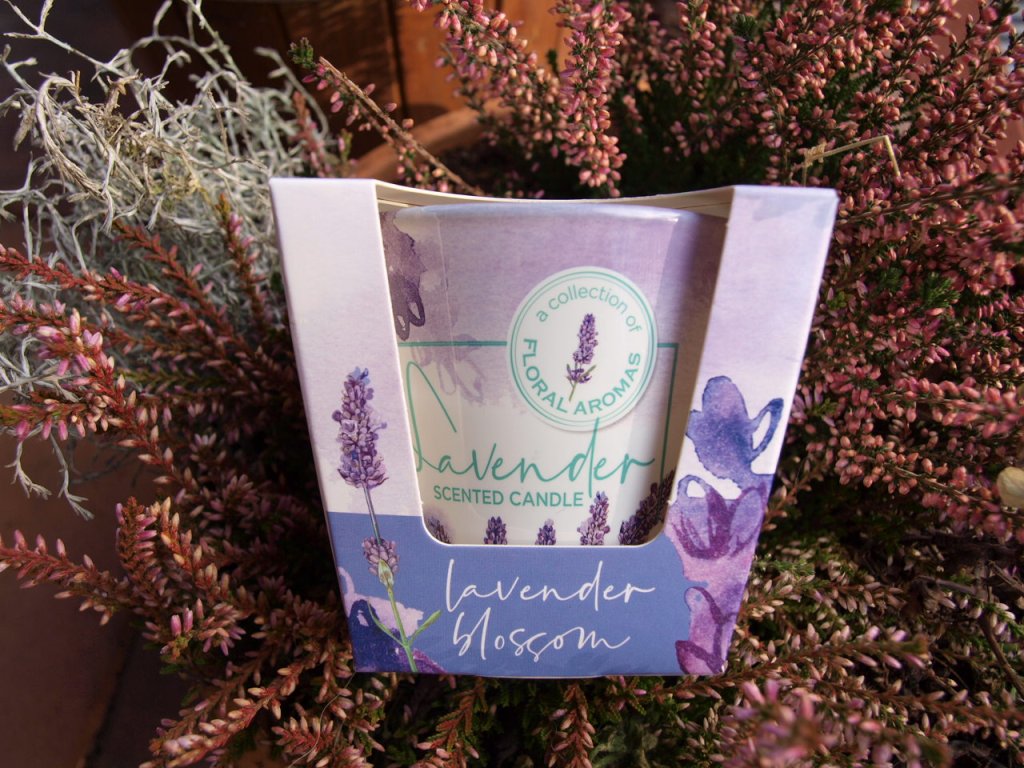 Parafínová svíčka v kónickém skle v papírovém přebalu s vůní levandule Milý dárek Obsah vosku 115g Doba hoření 30 hodin