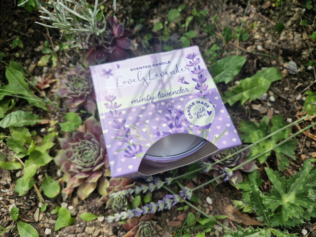 Svíčka ve skleněném kalíšku s oblíbenou levandulovou vůní Dárkově zabalena do papírové kazety Doba hoření 22 hodin